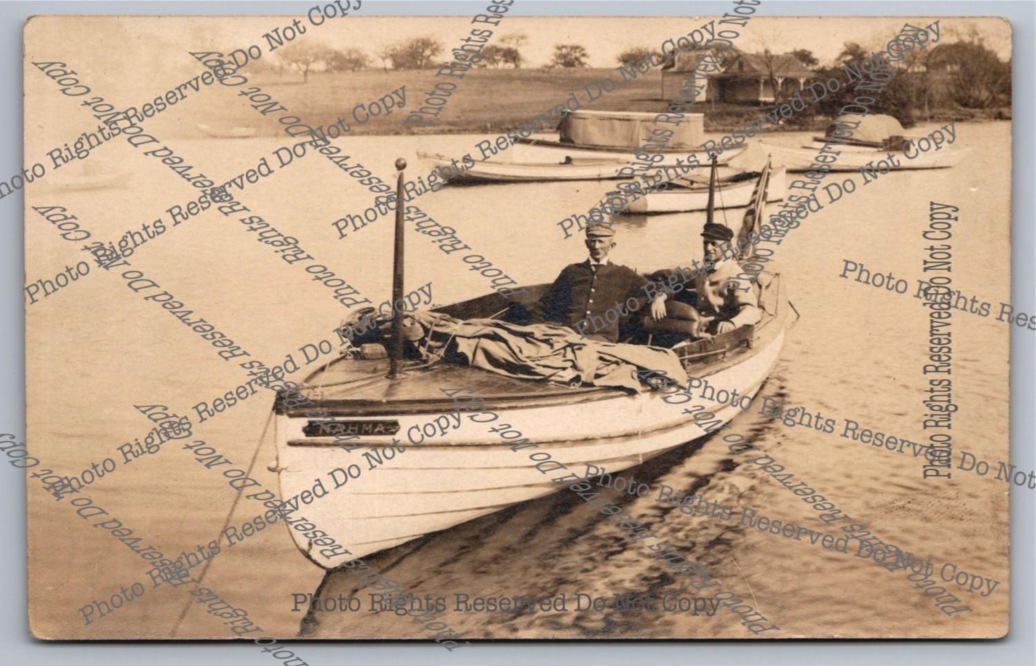 Antique RPPC Sporty Motorboat Dockside With Bow-tied Gents Real Photo Postcard