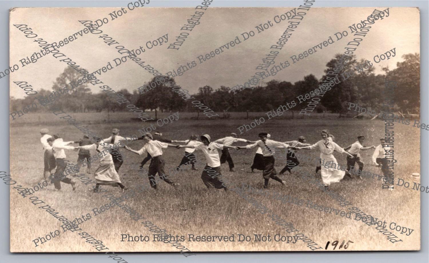 Antique 1915 RPPC Young Men&Women Dance in Ring in Field Real Photo Postcard