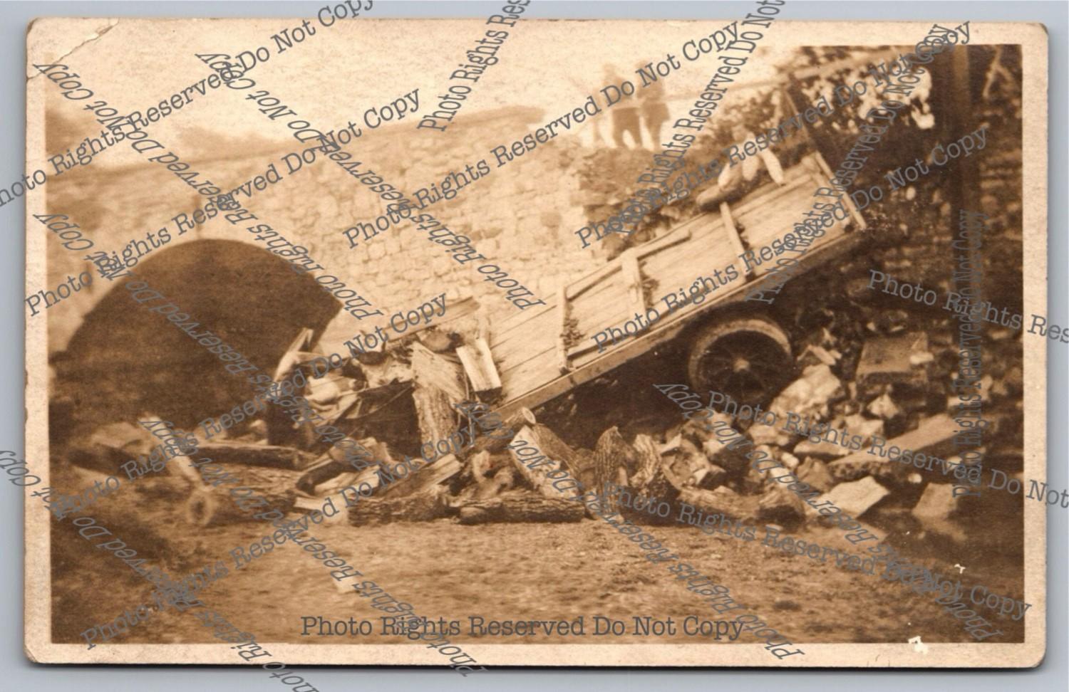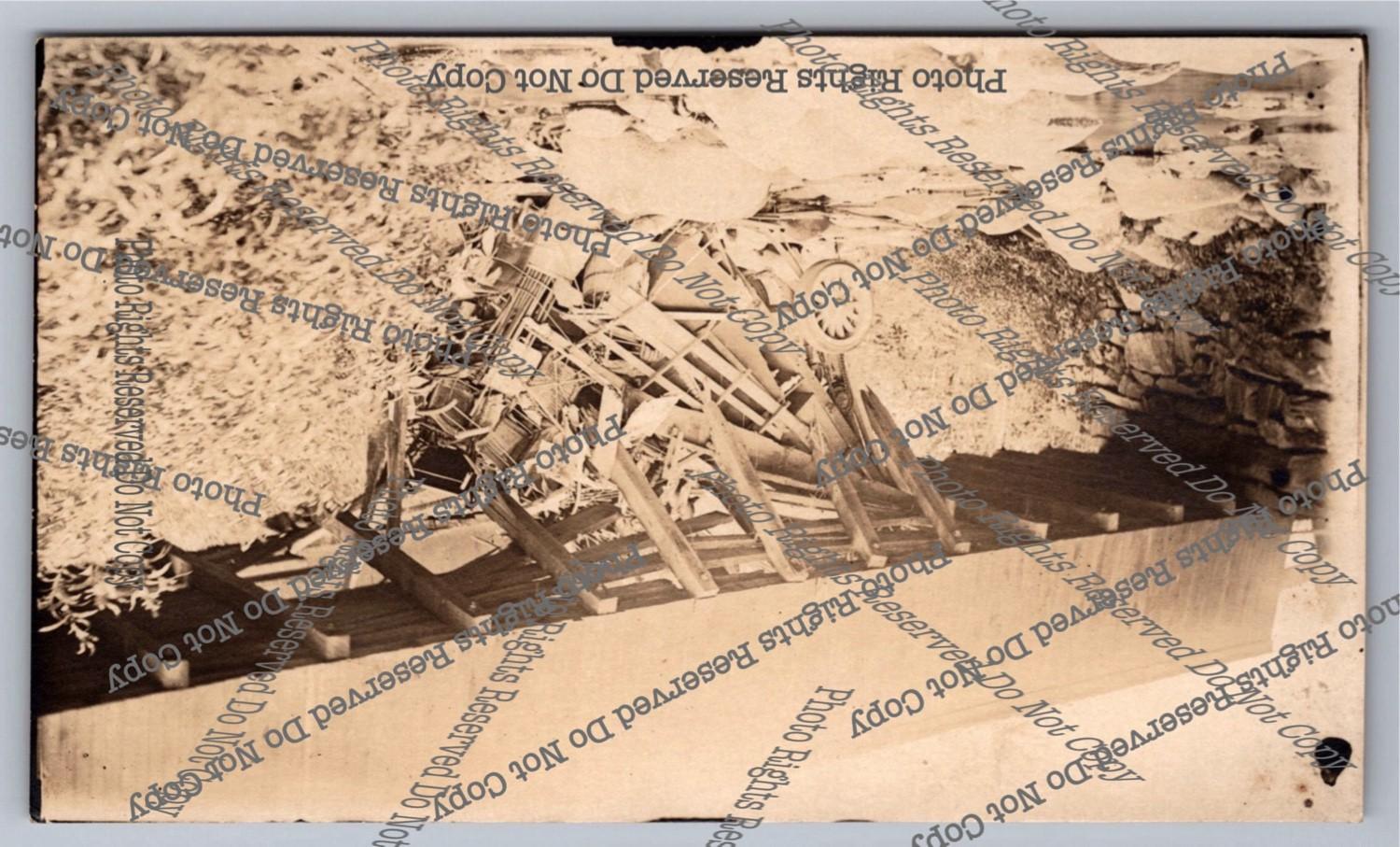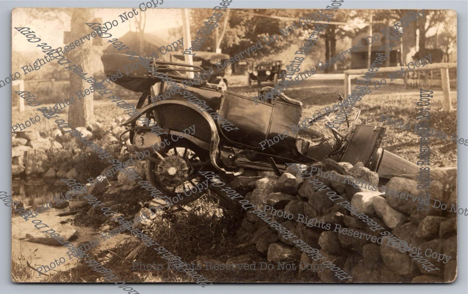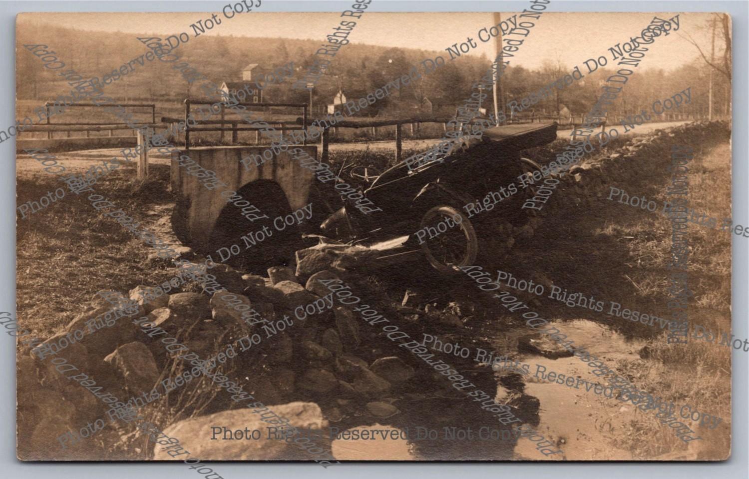 Antique RPPC Wrecked Car Astride Stone Wall Bridge Culvert Real Photo Postcard