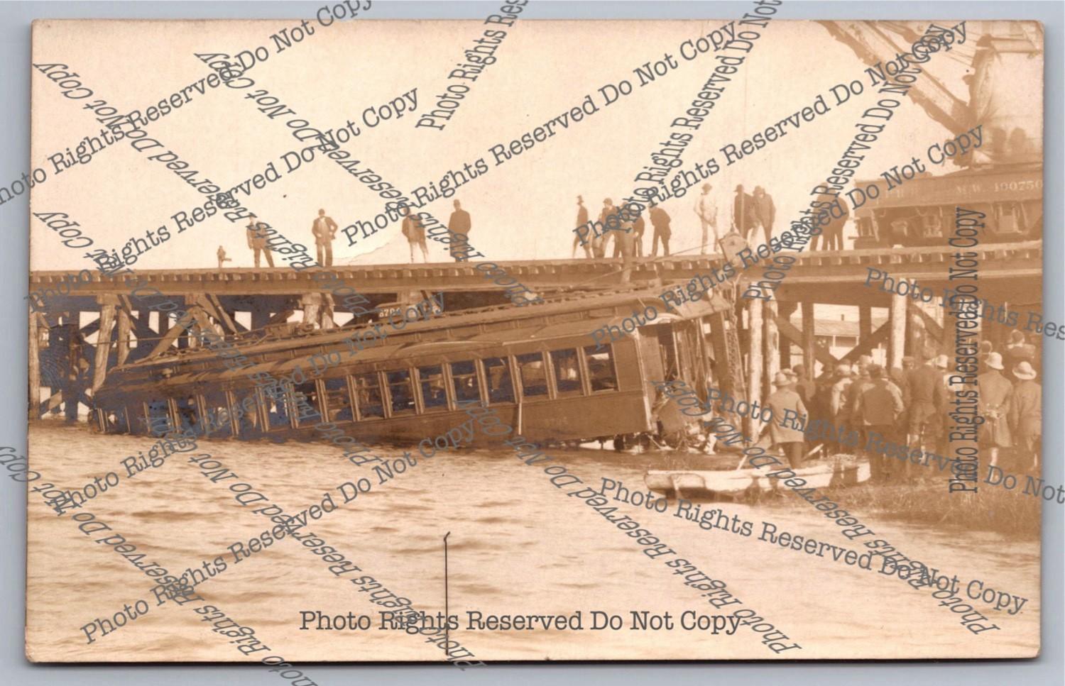 Vintage Postcard Atlantic City? Train Trolley Wreck Bridge Water Spectators RPPC