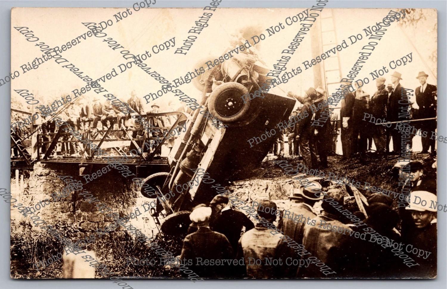Antique RPPC Wreck Crane Lifts crashed car auto on River Bridge Photo Postcard