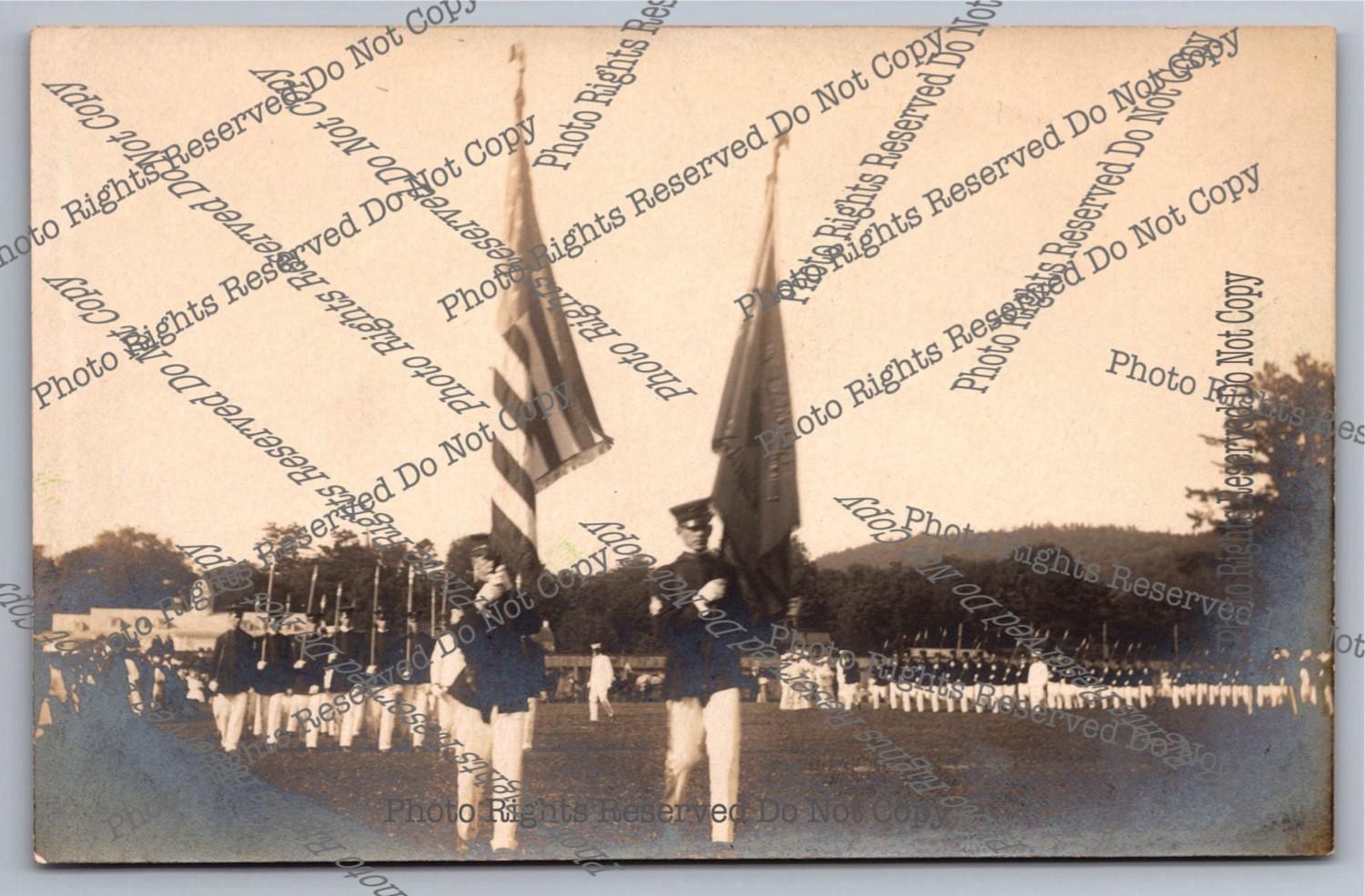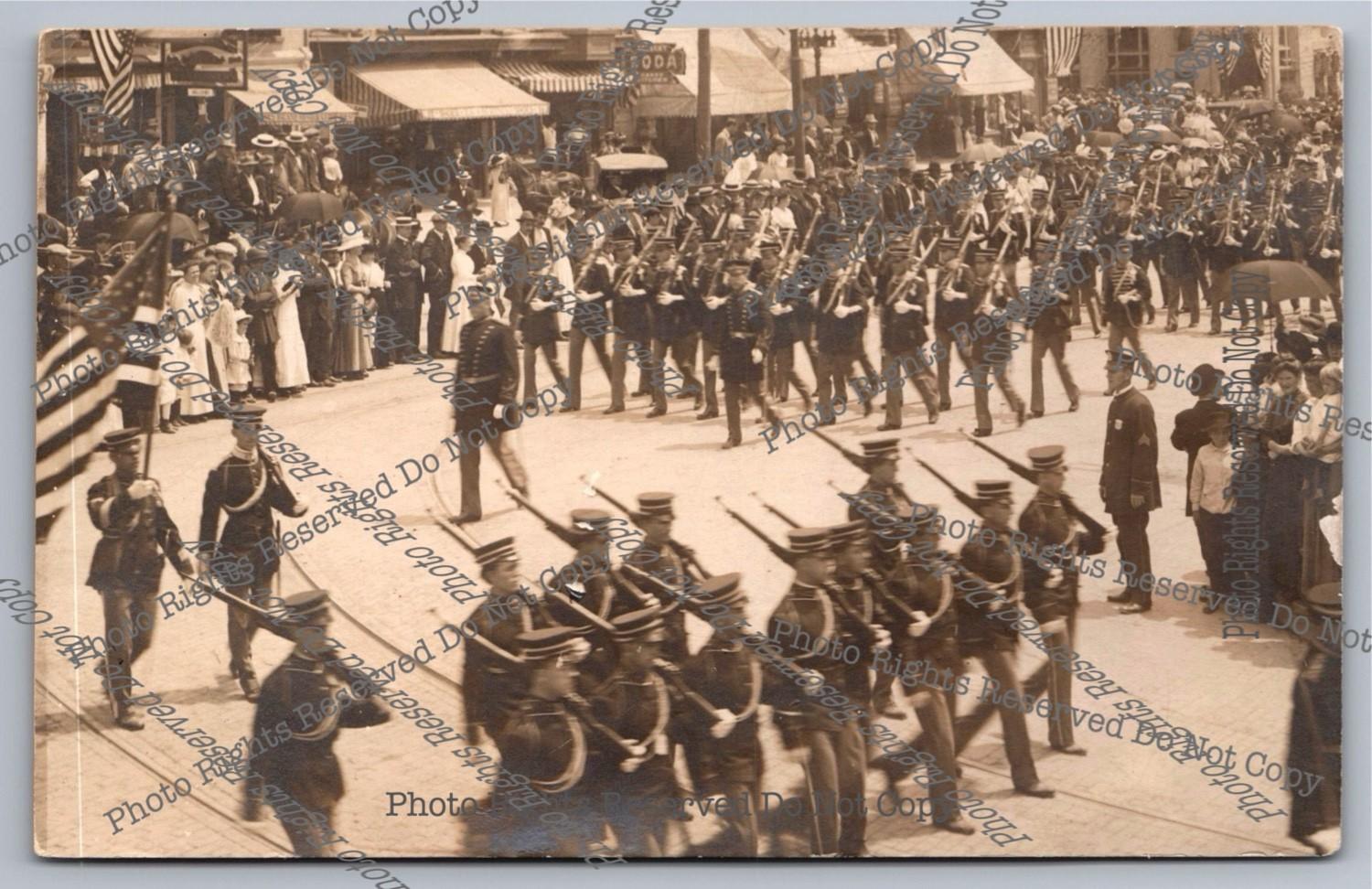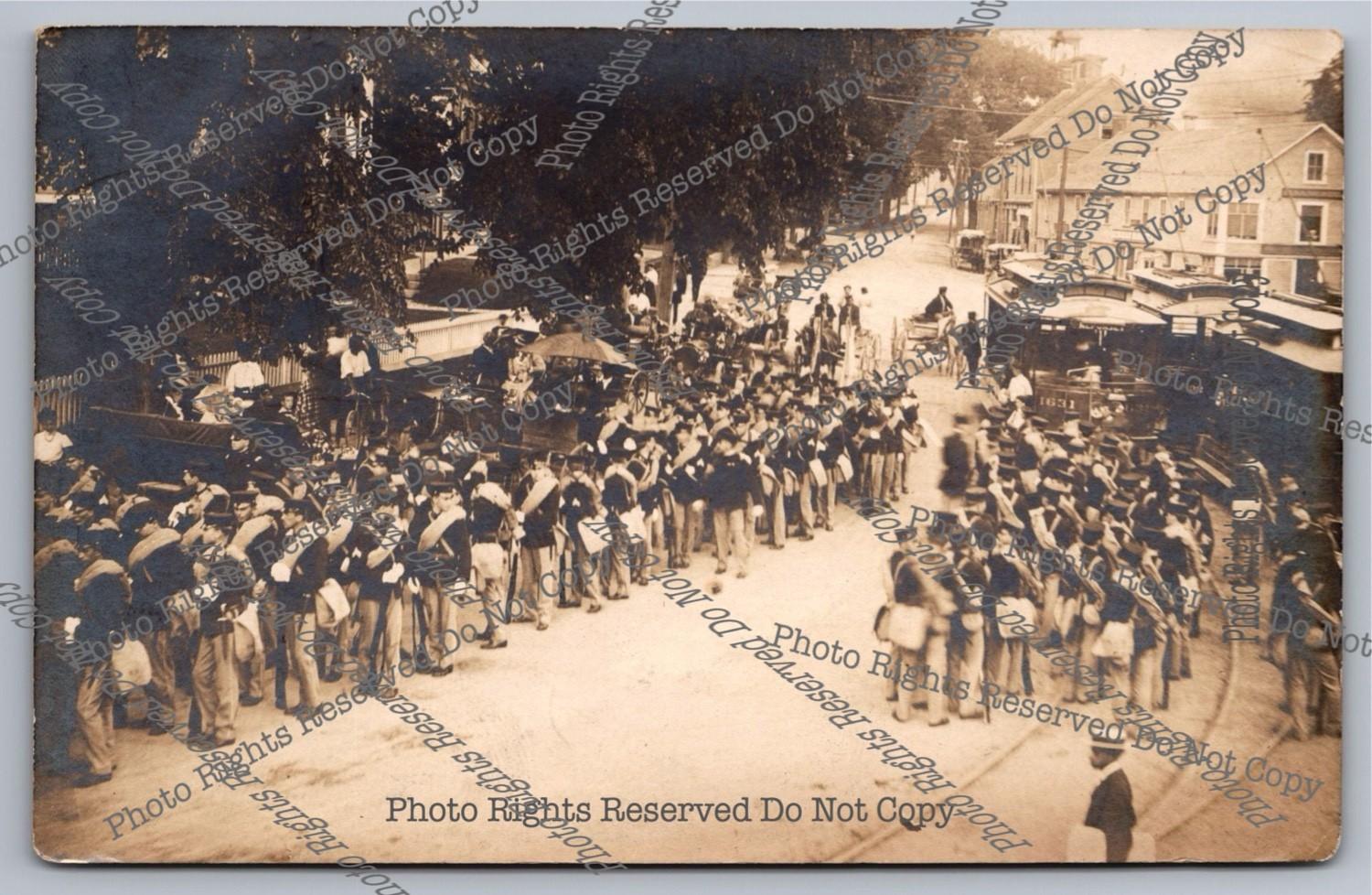 Antique RPPC Military Cadets? Dorchester Day Parade? Trolley Real Photo Postcard