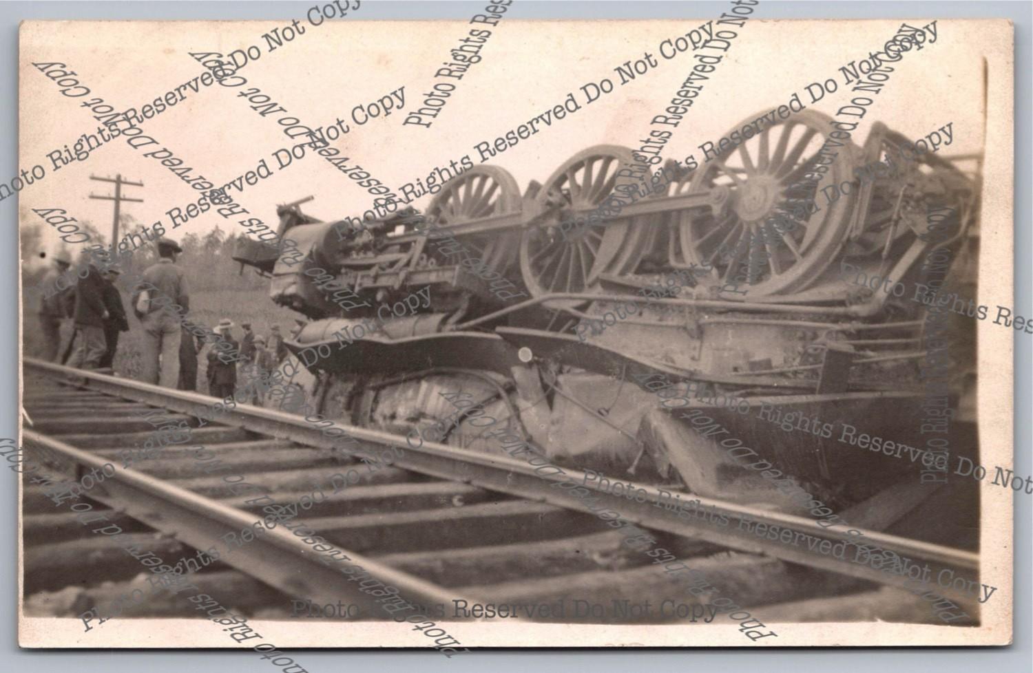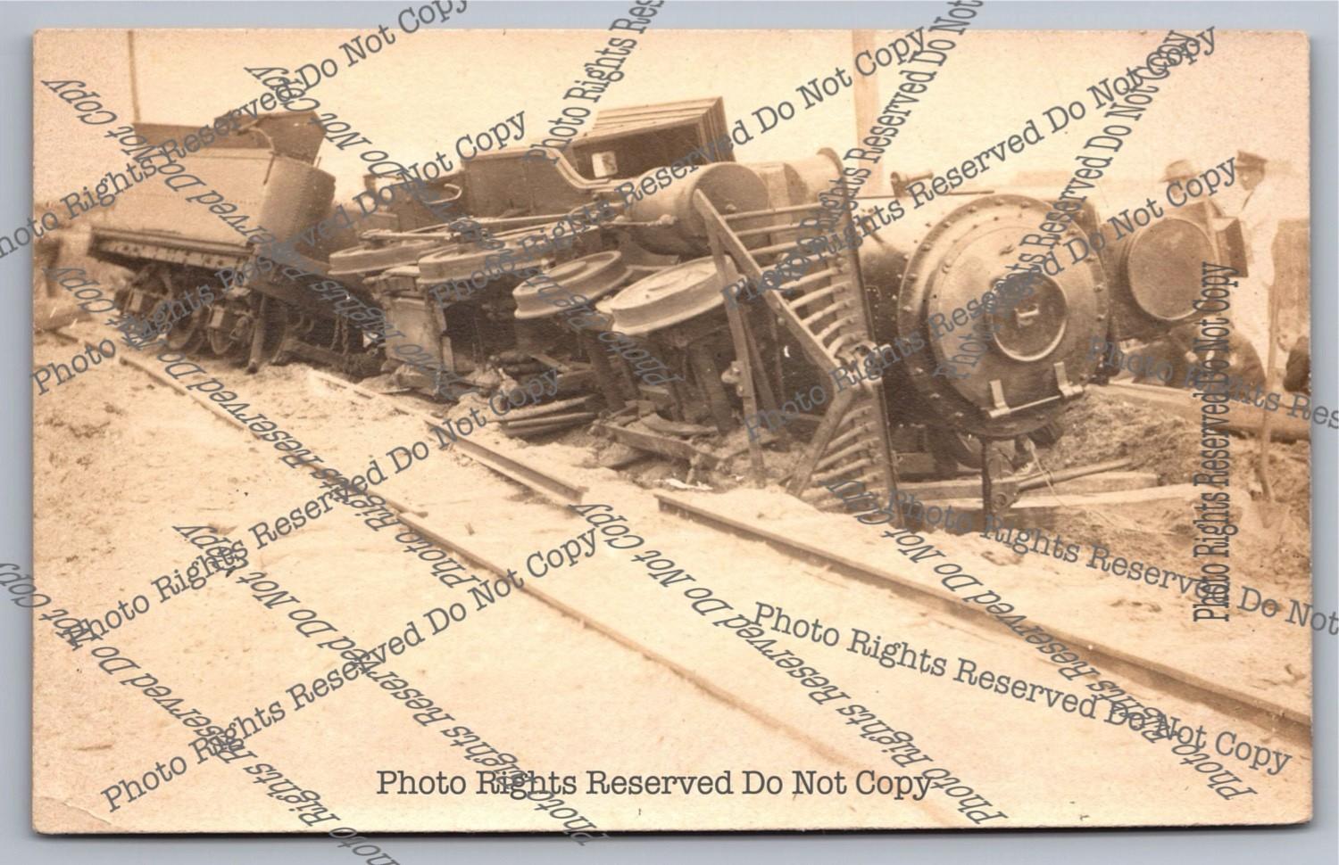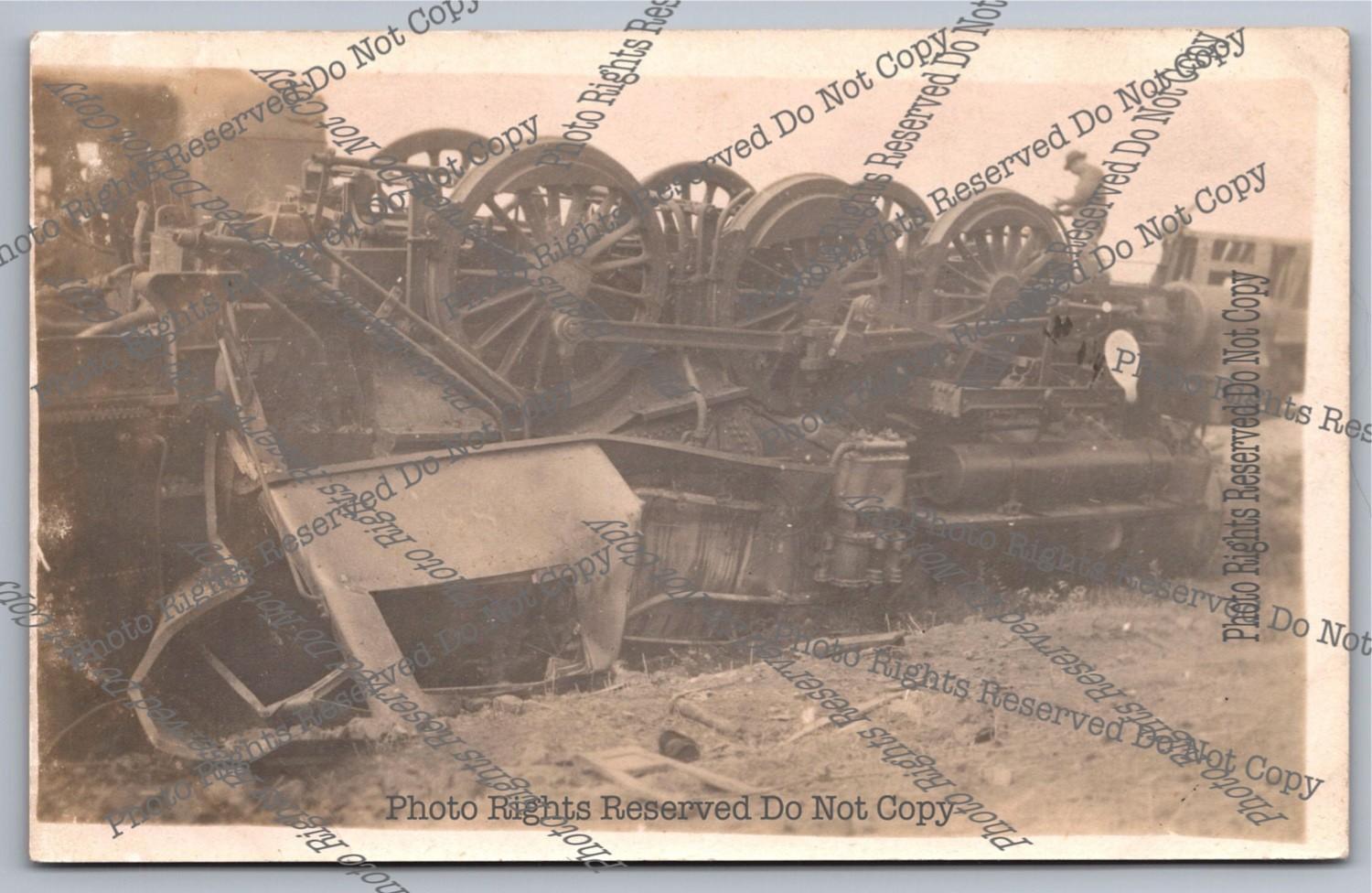 Antique RPPC train steam locomotive&tender Roll Over Wreck Real Photo Postcard
