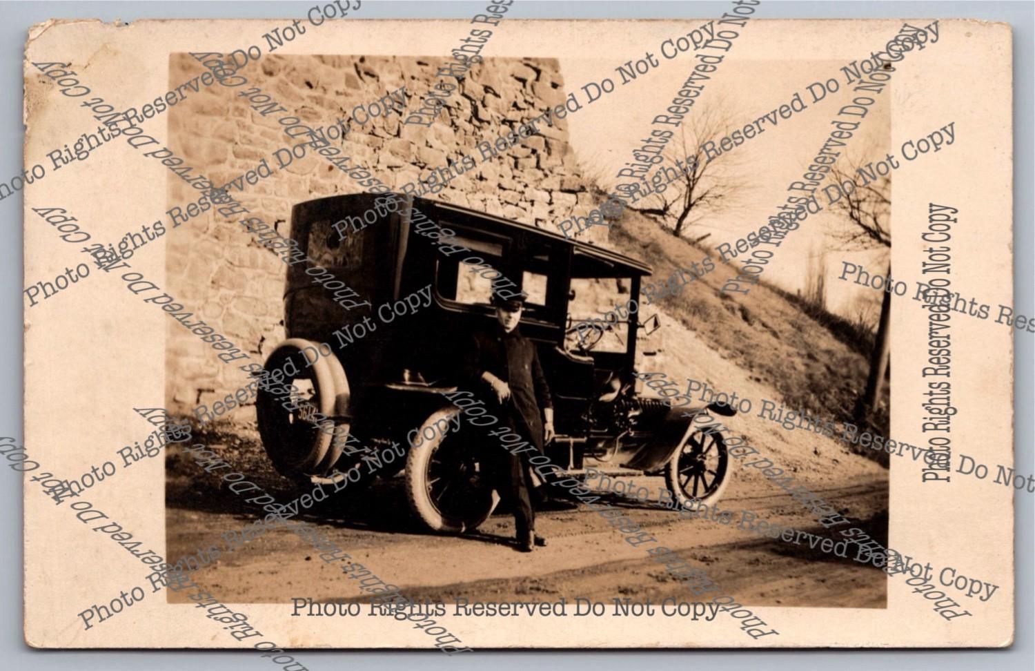 Antique RPPC Chauffer Poses With His Limousine Stone Wall Real Photo Postcard