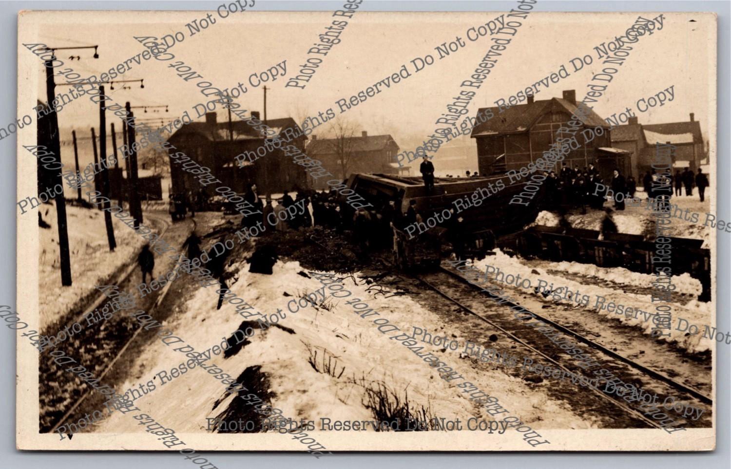 Vintage RPPC Train Derailment Middle Small Town Snow Real Photo Postcard