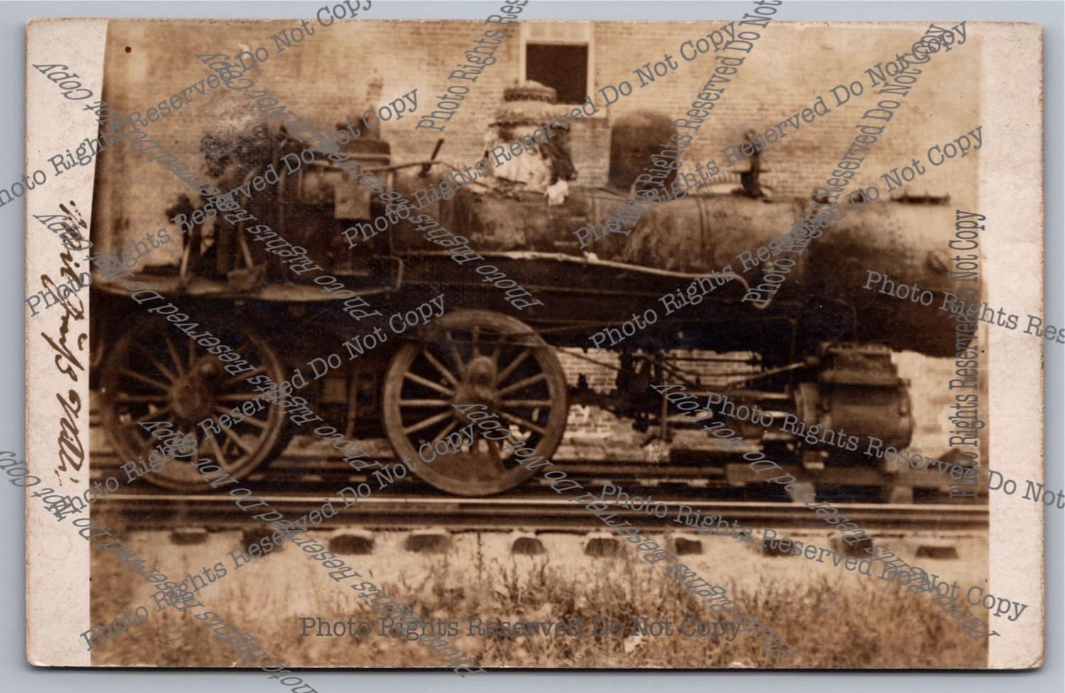 Antique RPPC Steam Locomotive Wreck Destruction Building Real Photo Postcard