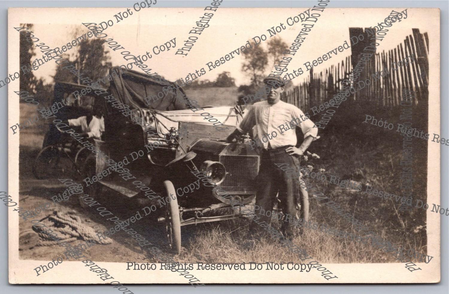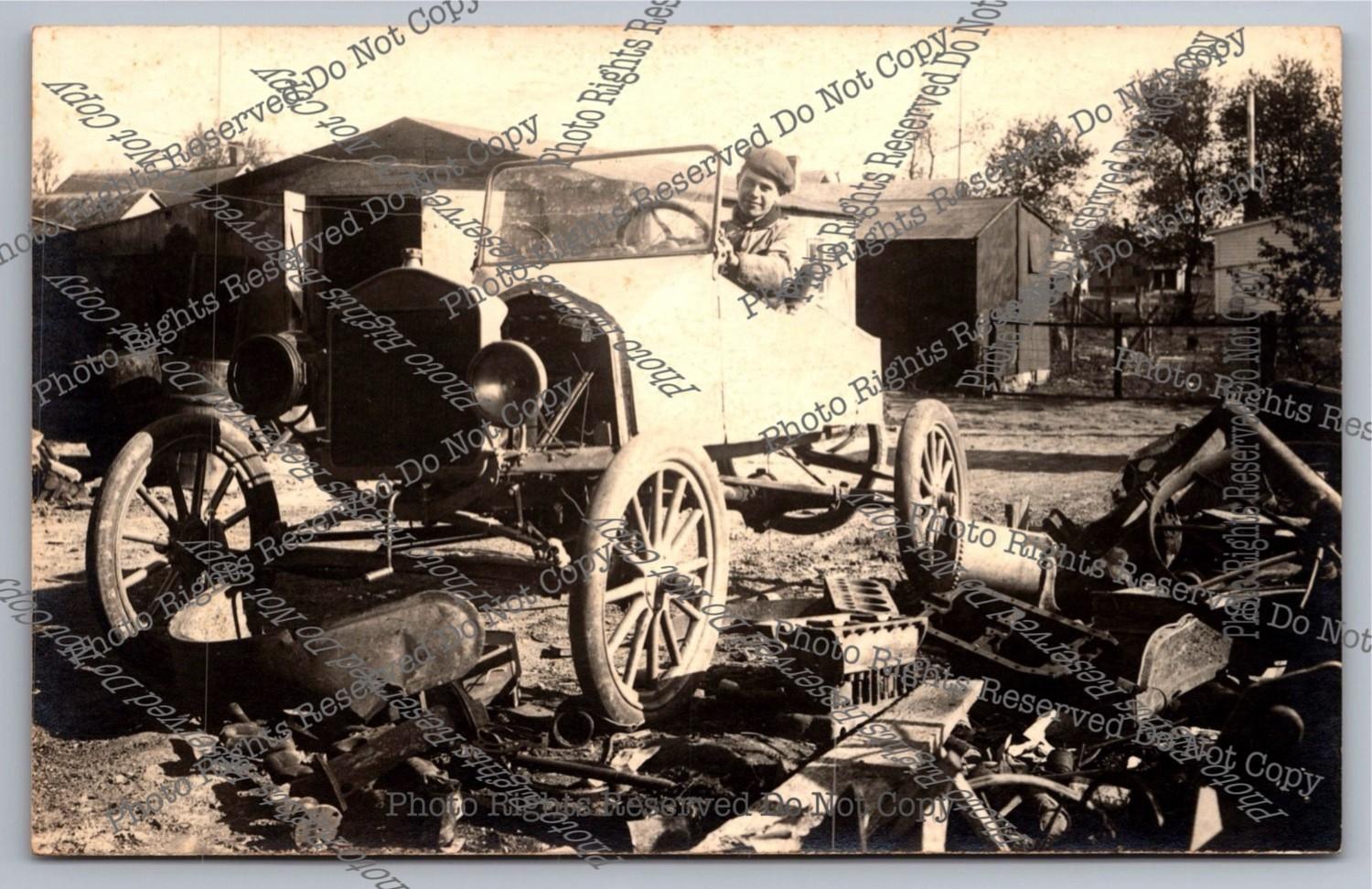 Antique RPPC Man Posing by Wrecked Ford? Automobile Car Real Photo Postcard