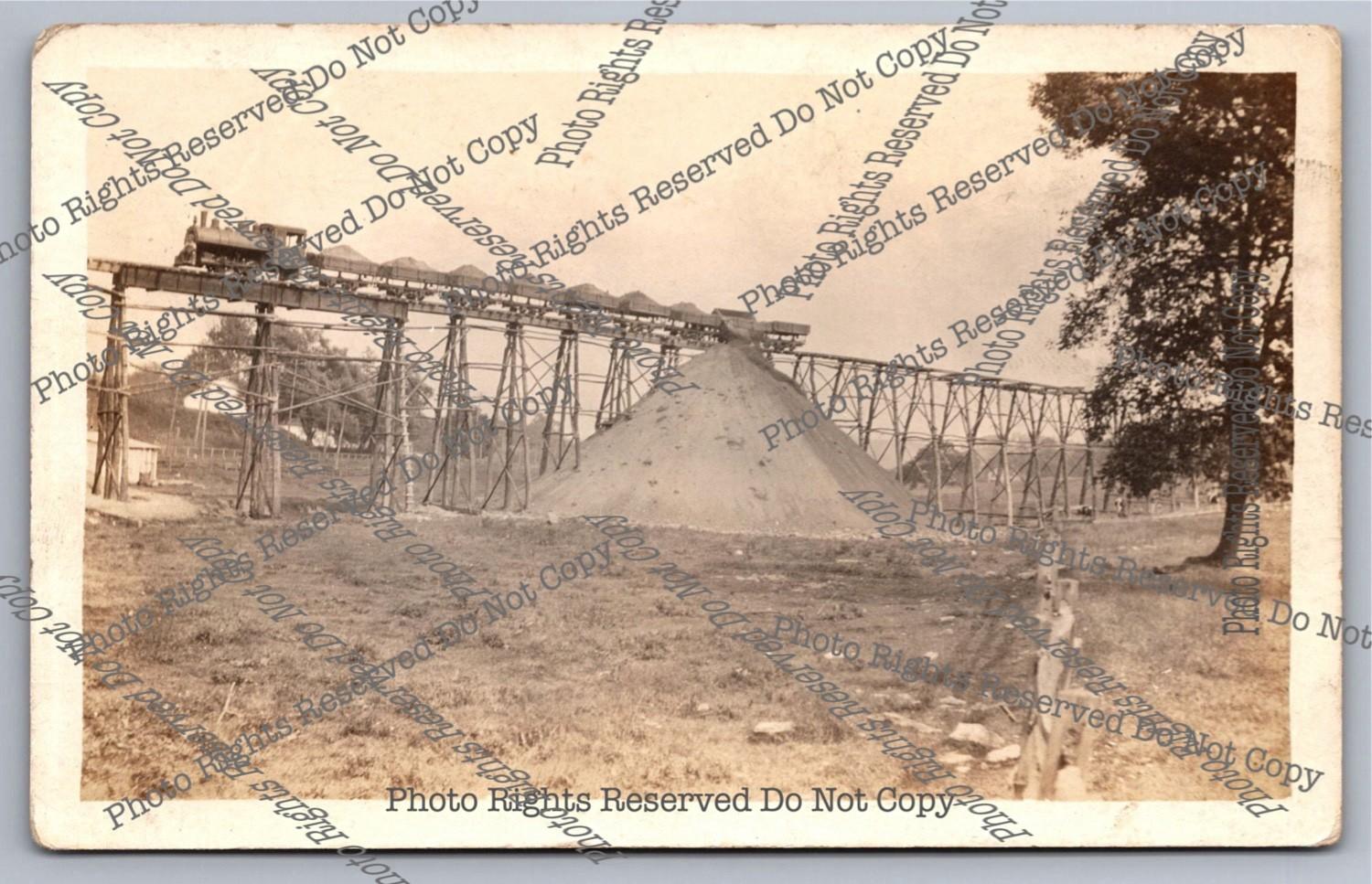 Vintage RPPC Steam Locomotive Trestle Dumping Gravel? Into Huge Pile Postcard