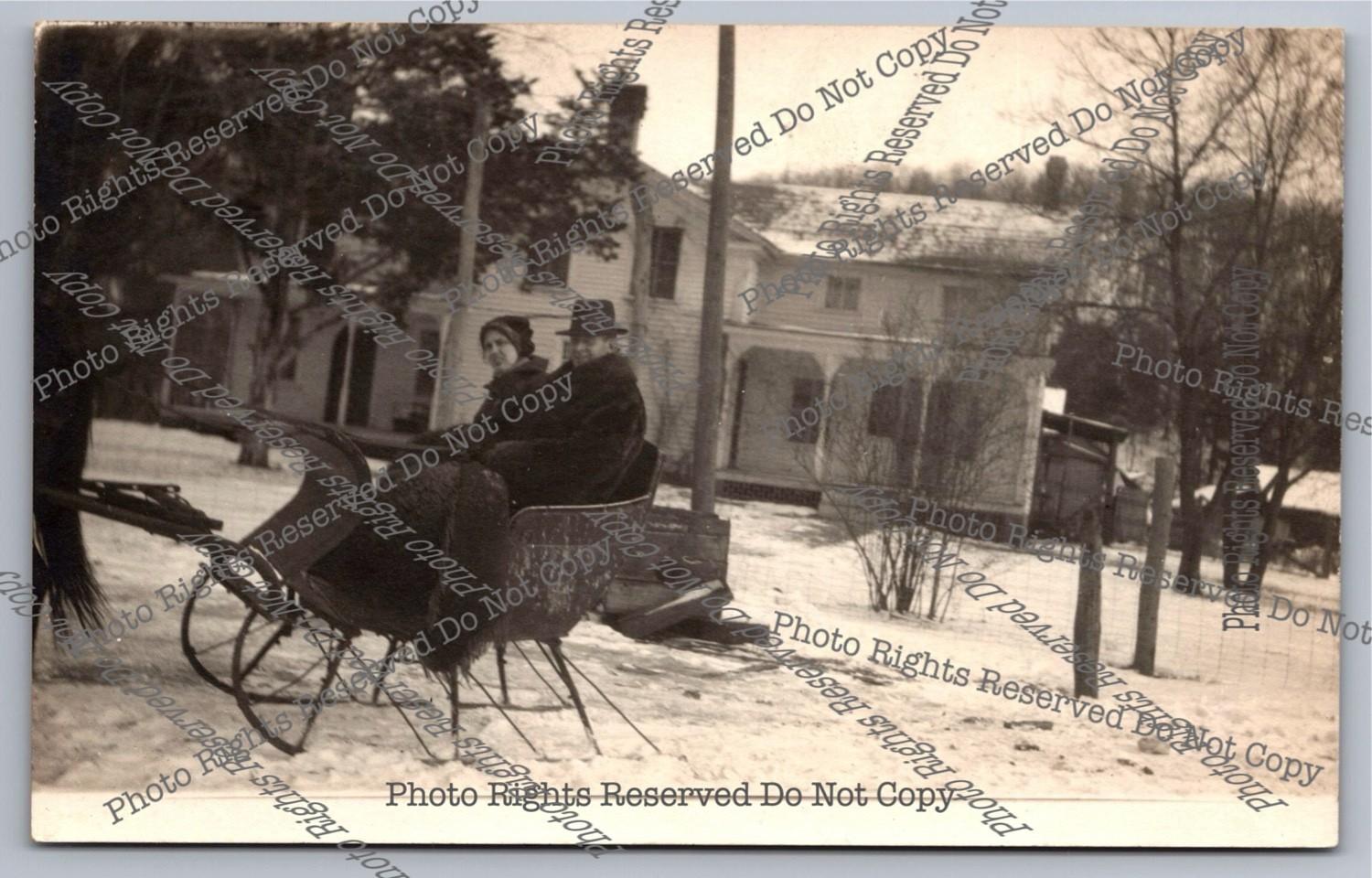 Antique RPPC Couple In One Horse Open Sleigh Snow House Real Photo Postcard