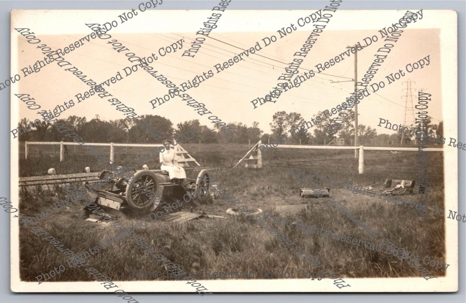 Antique RPPC Woman Sits Car Wreck Train Collision? Real Photo Postcard 2 of 2