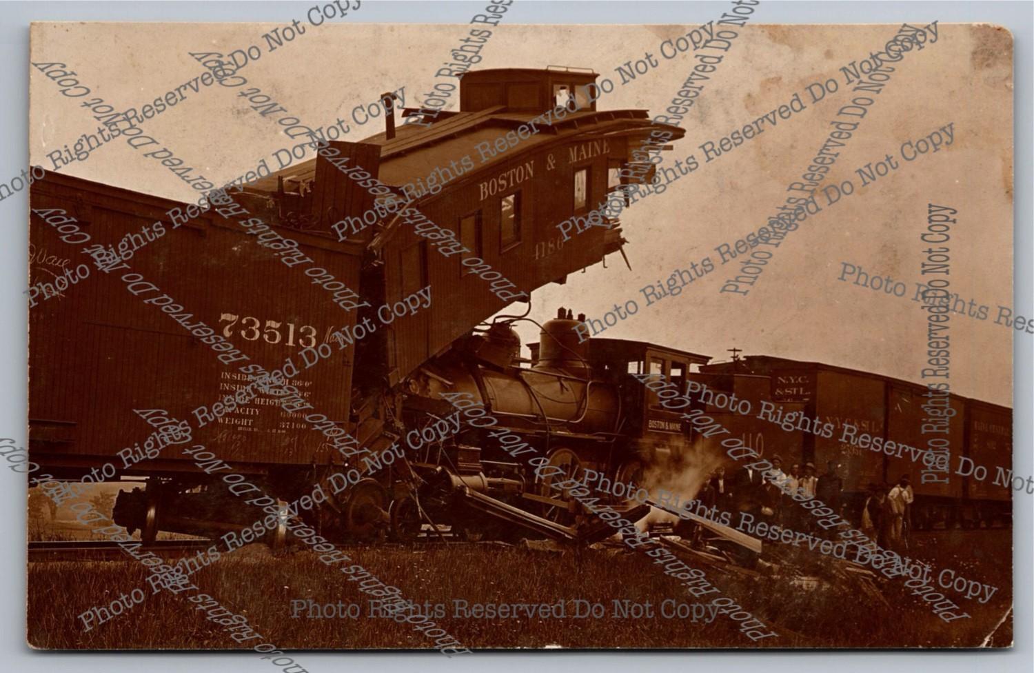 1907 RPPC Boston&Maine Locomotive Under Rear Ended Caboose Photo Postcard