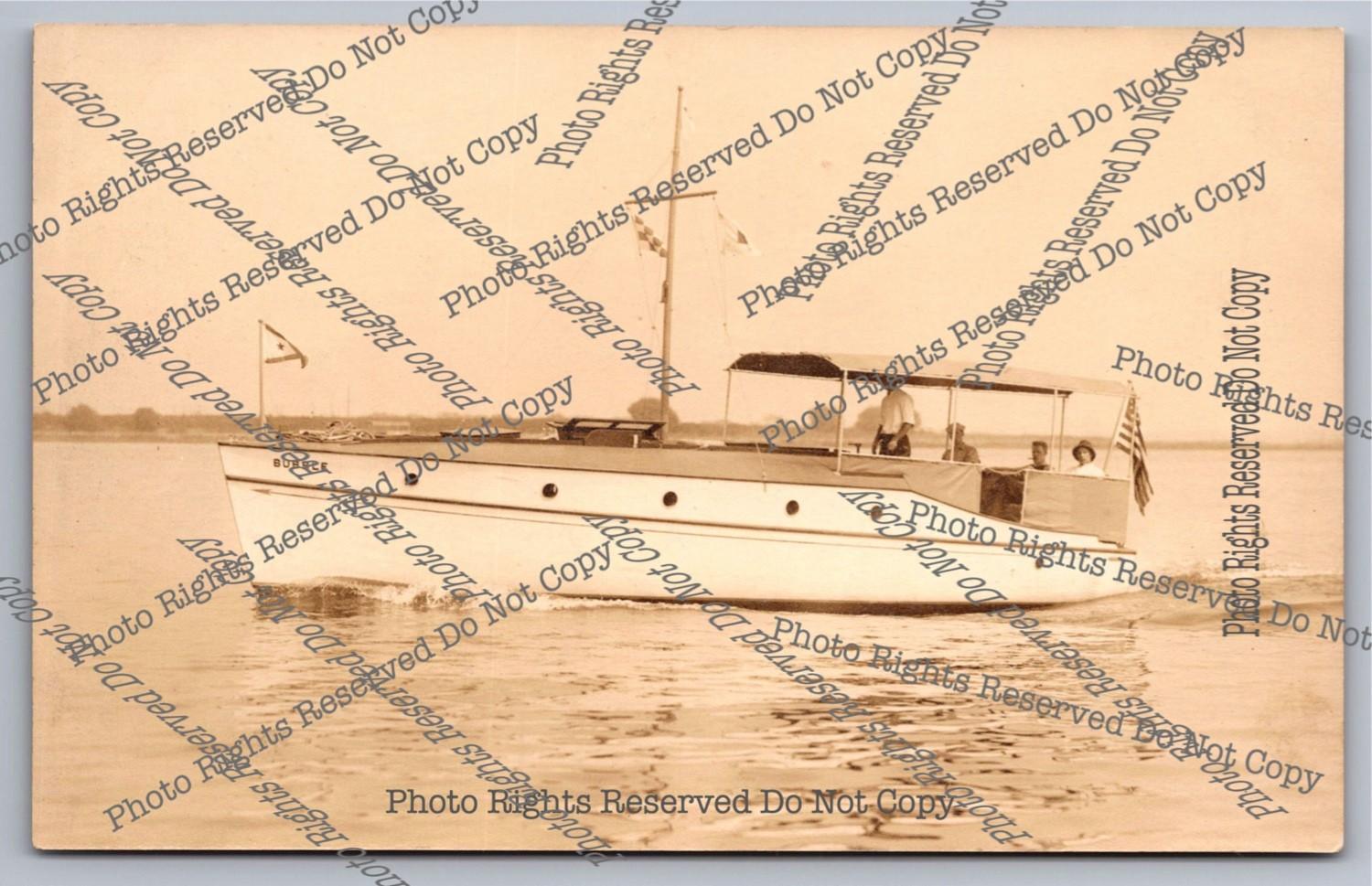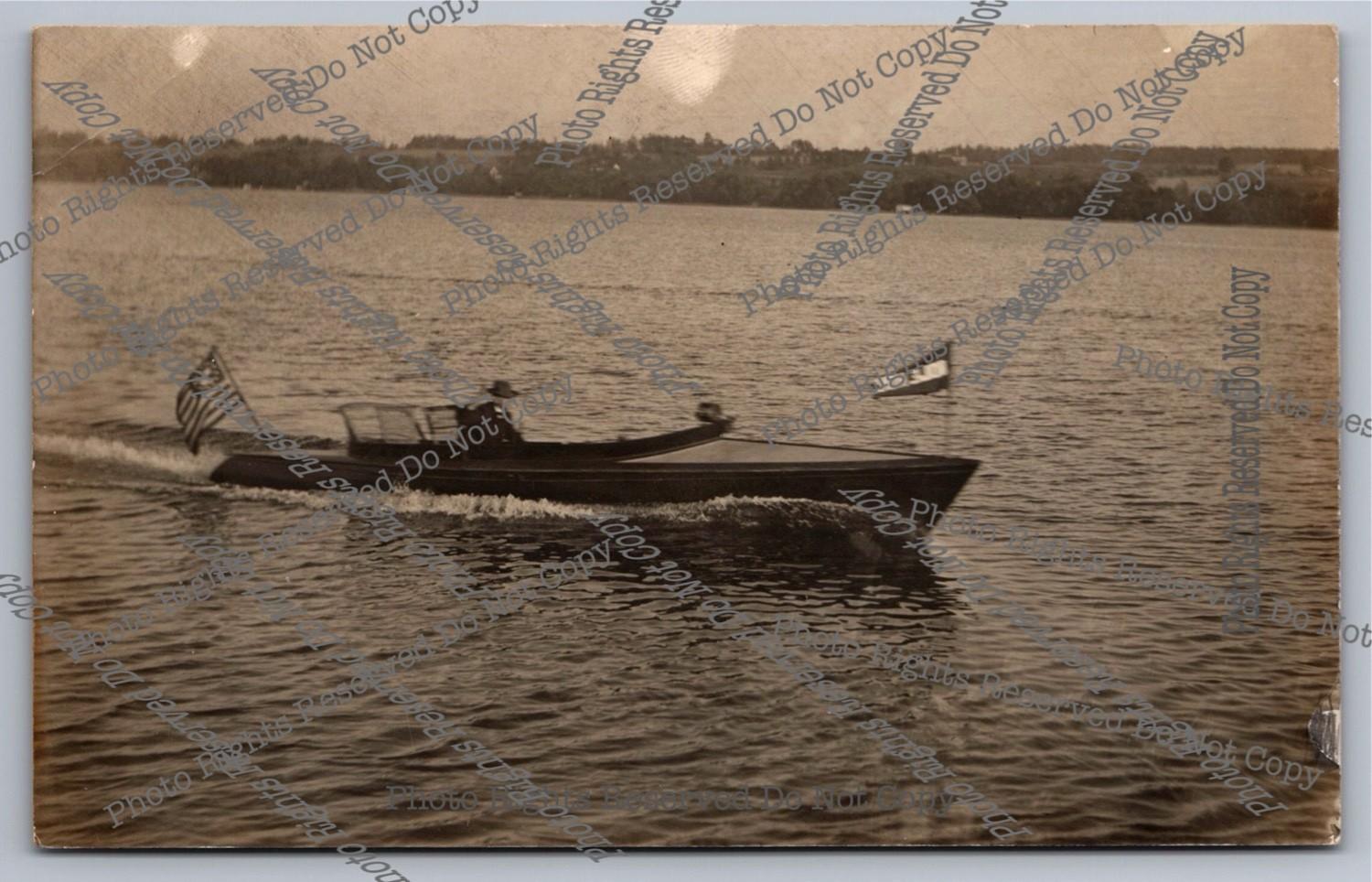 Antique RPPC Sporty Wooden Motor Boat In Action Yacht Ensign Real Photo Postcard