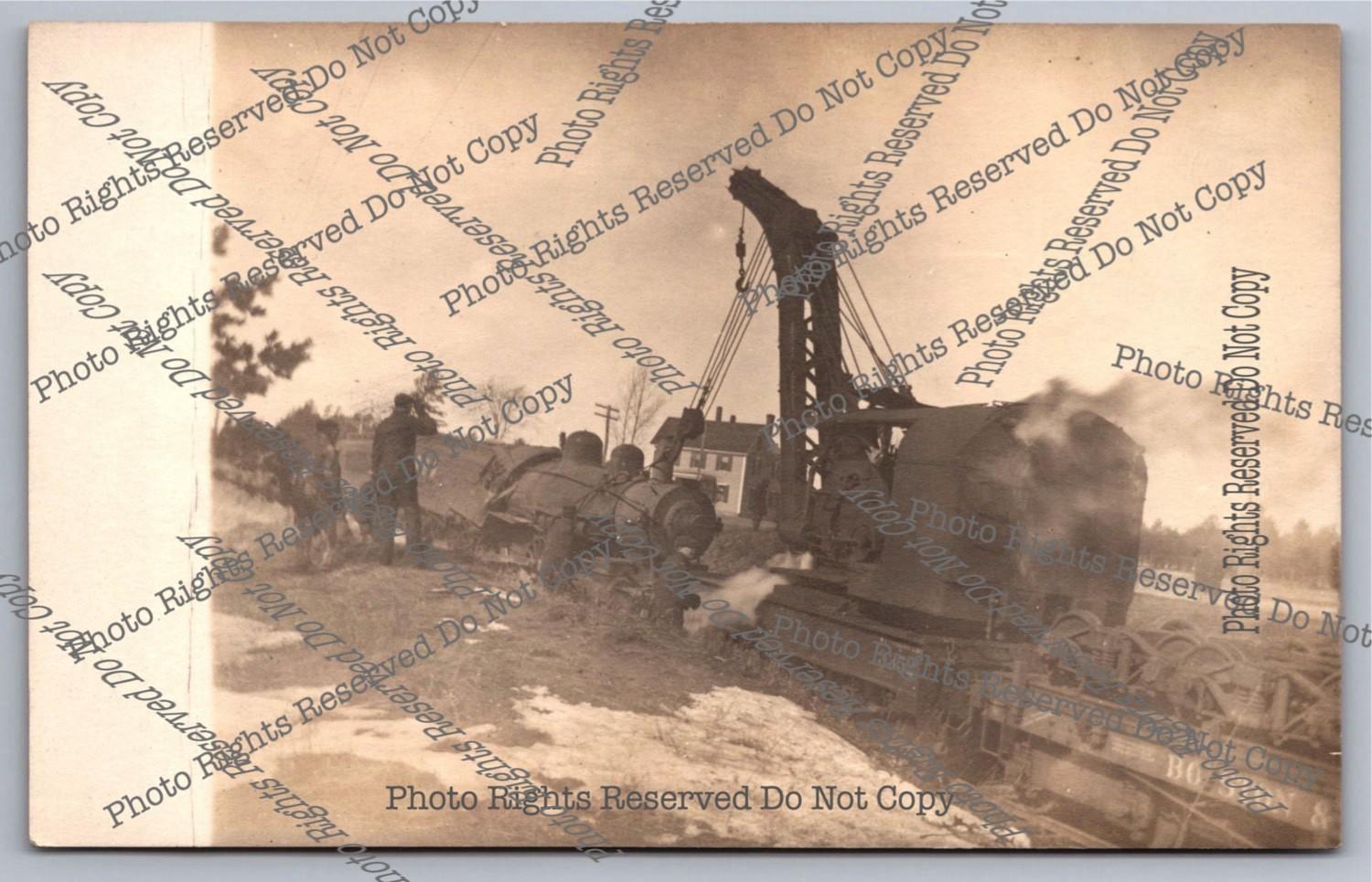 Antique RPPC B&M Crane Lifts Derailed Steam Locomotive Real Photo Postcard