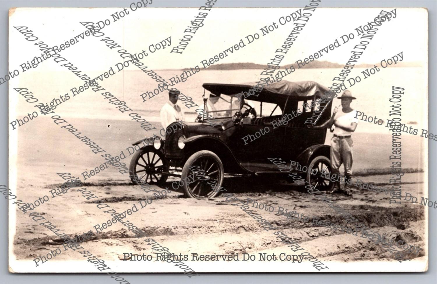 Antique RPPC car automobile Ford Model T stuck? on beach Real Photo Postcard