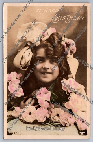 Antique RPPC real photo postcard young girl with flowers"A Happy Birthday"