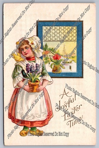 Antique Postcard A Joyful Easter Time Dutch girl with flowers embossed