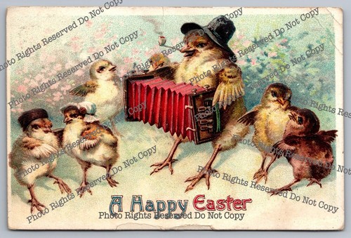 Antique Postcard 1910 A Happy Easter bird playing accordion