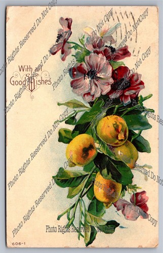 Antique Postcard 1909 embossed With All Good Wishes fruit and flowers bouquet