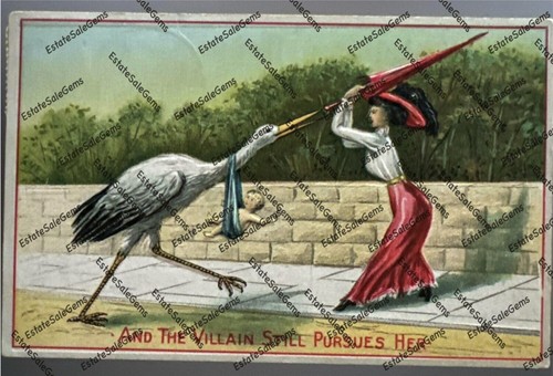 antique postcard 1912 And The Villain Still Pursues Her stork woman antinatalism
