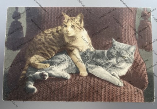 antique postcard two cats on a chair orange brown tabby and grey white Germany