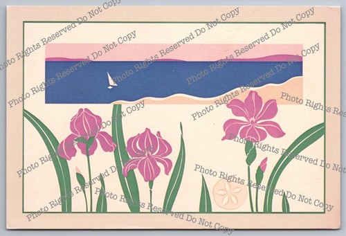 Vintage Postcard 1986 stylized irises sea sailboat Blue Mountain Printmakers Inc