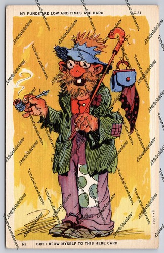 Vintage Postcard comic cartoon hobo"My Funds Are Low And Times Are Hard"unused
