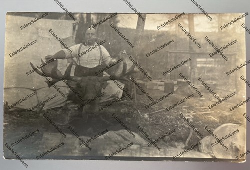Antique RPPC man hunting camp dead moose hunter shoot woods Real Photo Postcard