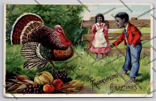 Antique Postcard 1911 Thanksgiving Greetings African American children turkey