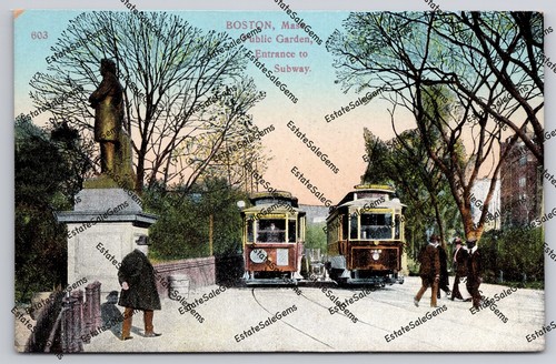 Antique Postcard Boston Massachusetts Public Garden Entrance To Subway MBTA cars