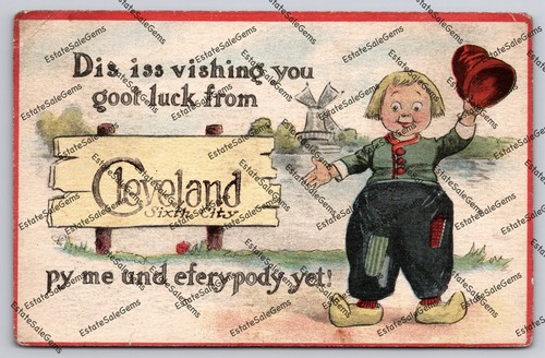 Antique Postcard 1913 illustrated good luck greeting Dutch boy Cleveland Ohio