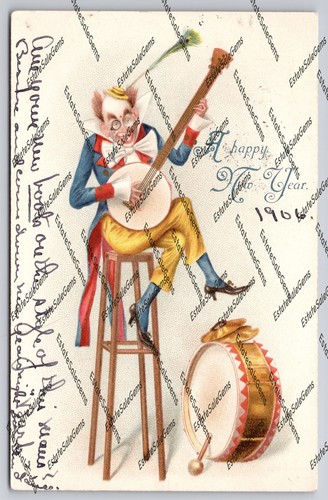 Antique Postcard 1906 Happy New Year clown playing banjo
