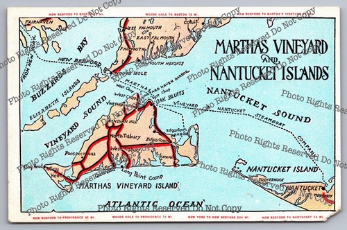 Vintage Postcard Martha's Vineyard and Nantucket Islands map with mileages